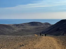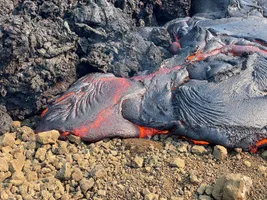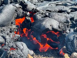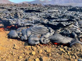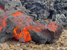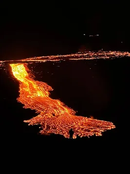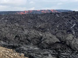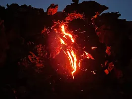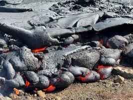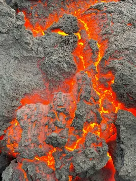 Even far away from the volcano, the hardened lava is burning hot. You can’t go too close, and even a few meters away, you will still be extremely hot. You should never forget that under the black hardened lava molten lava keeps flowing and pushing it forward. Under this pressure, the hardened lava can fall at any time. Occasionally, the molten orange lava is exposed, and you might be able to press on it with a long stick for example, or throw a rock. You see the lava flowing like a liquid, but surprisingly it is rock hard, and you won’t be able to stick anything in it.
