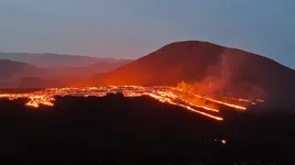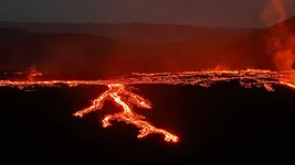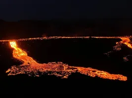 When you move your eyes further away from the volcano, you will see the molten lava river that flows away and floods the surrounding valleys. The further the lava river gets, the more it will harden and turn black on the surface. The molten lava river doesn’t stop there. It goes underneath the hard shell on the surface. In some places, you will be able to see glowing orange cracks under the contrasting black lava.