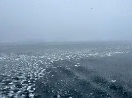 During winter the water at the shore freezes forming a thick layer of ice. Normally, in December this ice melts. Right now, on December 29, the ice sheet still covers a large surface of the water at the shore, as you can see in the images above. Pieces of this ice crack and start floating on the water until they melt.