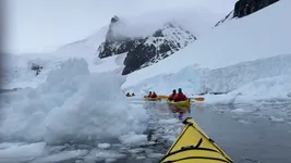 Of course we signed up for kayaking instead of zodiac cruising, but luck was not on our side. It was not bad though, with the zodiac they can get closer to ice than you safely can in a kayak, so we got to see up close the blue ice and the ship wrek. Those 2 penguins on top of the huge blue iceberg were extremely funny.