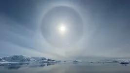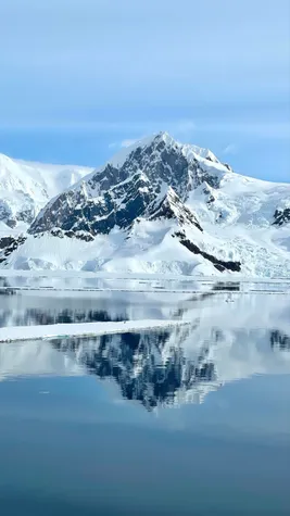 The sky was almost completely clear, with a deep blue color. Just like glacier lagoons have a turquoise color, the blue sheets of ice enhanced the blue color of the water creating a spectacular landscape. The calm wind transformed the water into a huge mirror having an almost perfect reflection of the mountains. The halo sun added one more mystical element to complete the perfect antarctic landscape.